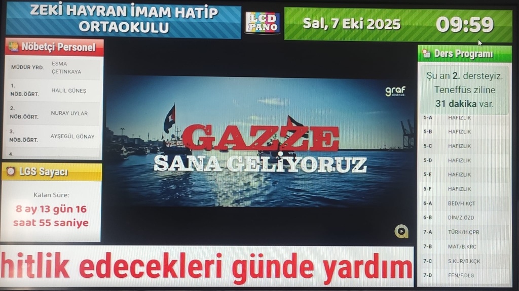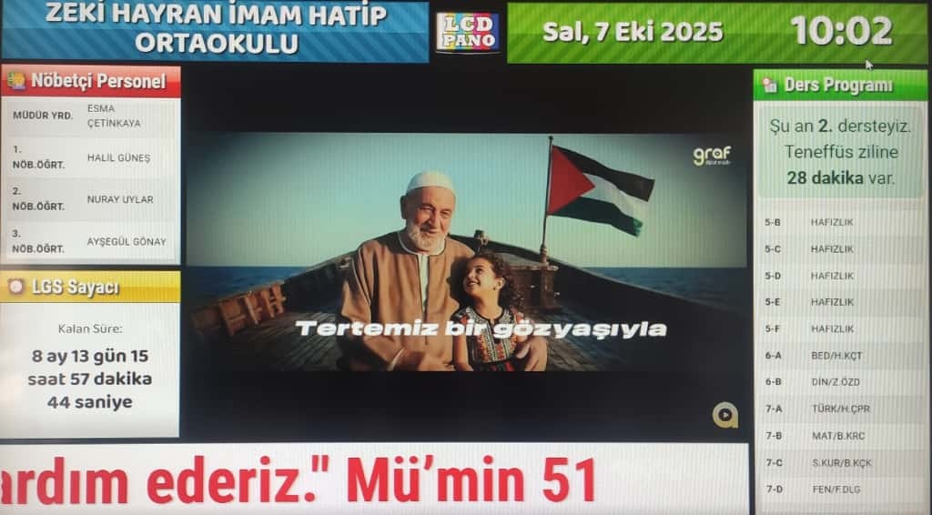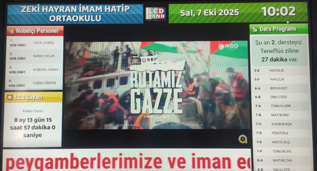 Okulumuzda 7 Ekim Salı Günü Filistin Farkındalık Etkinlileri düzenlendi. Ders zillerimiz Filistin marşları olurken, dijital panomuzda Filistin ile ilgili görseller paylaşıldı.