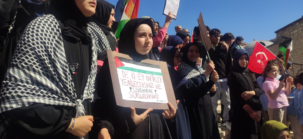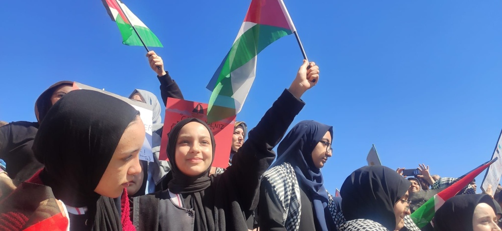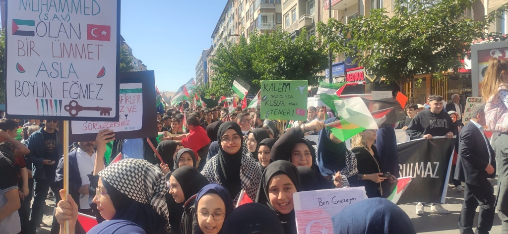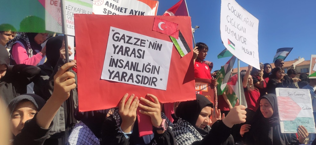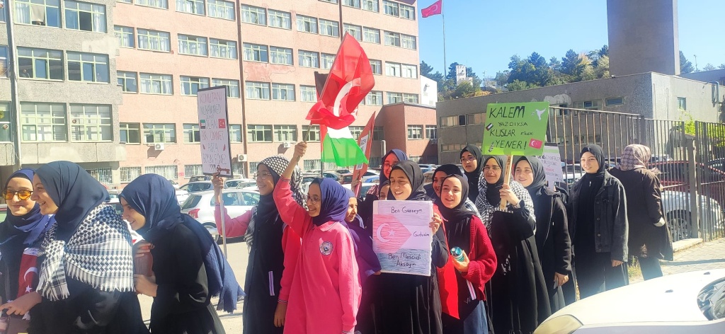 İlimizde yapılan yürüyüş etkinliğine de katılım sağlayan öğrencilerimiz Özgür Filistin ve dünya barışı için sloganlar attılar.