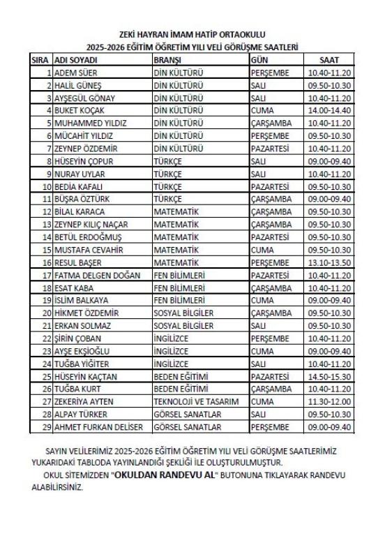 ÖĞREMEN - VELİ GÖRÜŞME SAATLERİMİZ